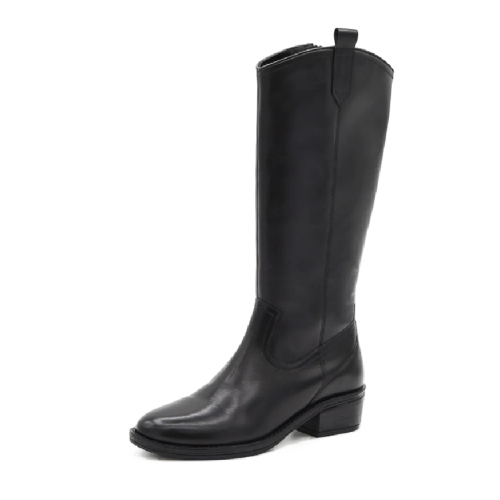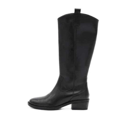 Descubre la elegancia atemporal de estas botas altas de piel negra, un básico de armario que nunca pasa de moda. Con un diseño inspirado en el estilo cowboy, se reinventan en clave urbana gracias a su acabado minimalista, su caña alta y su tacón bajo y cómodo, perfectas para el día a día.