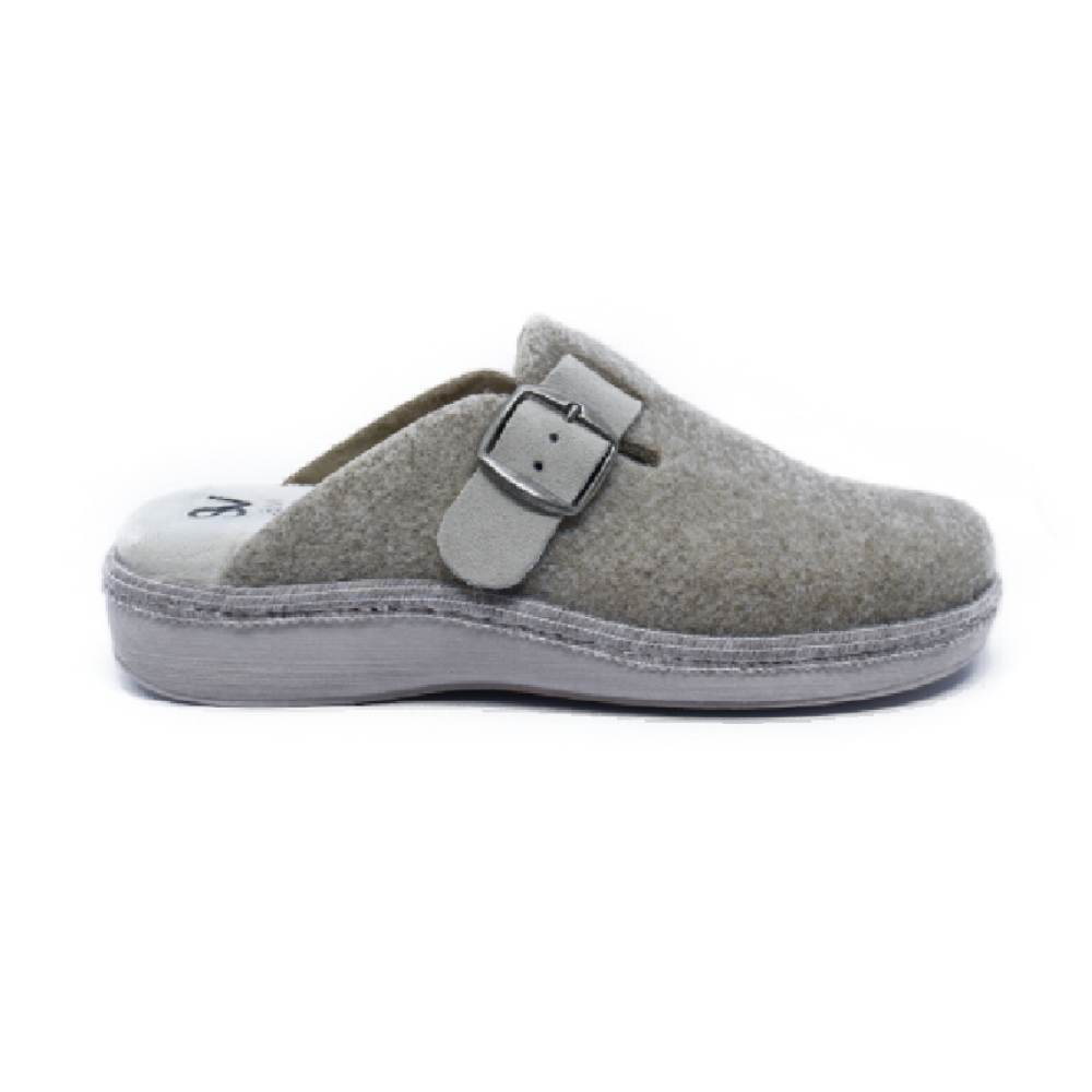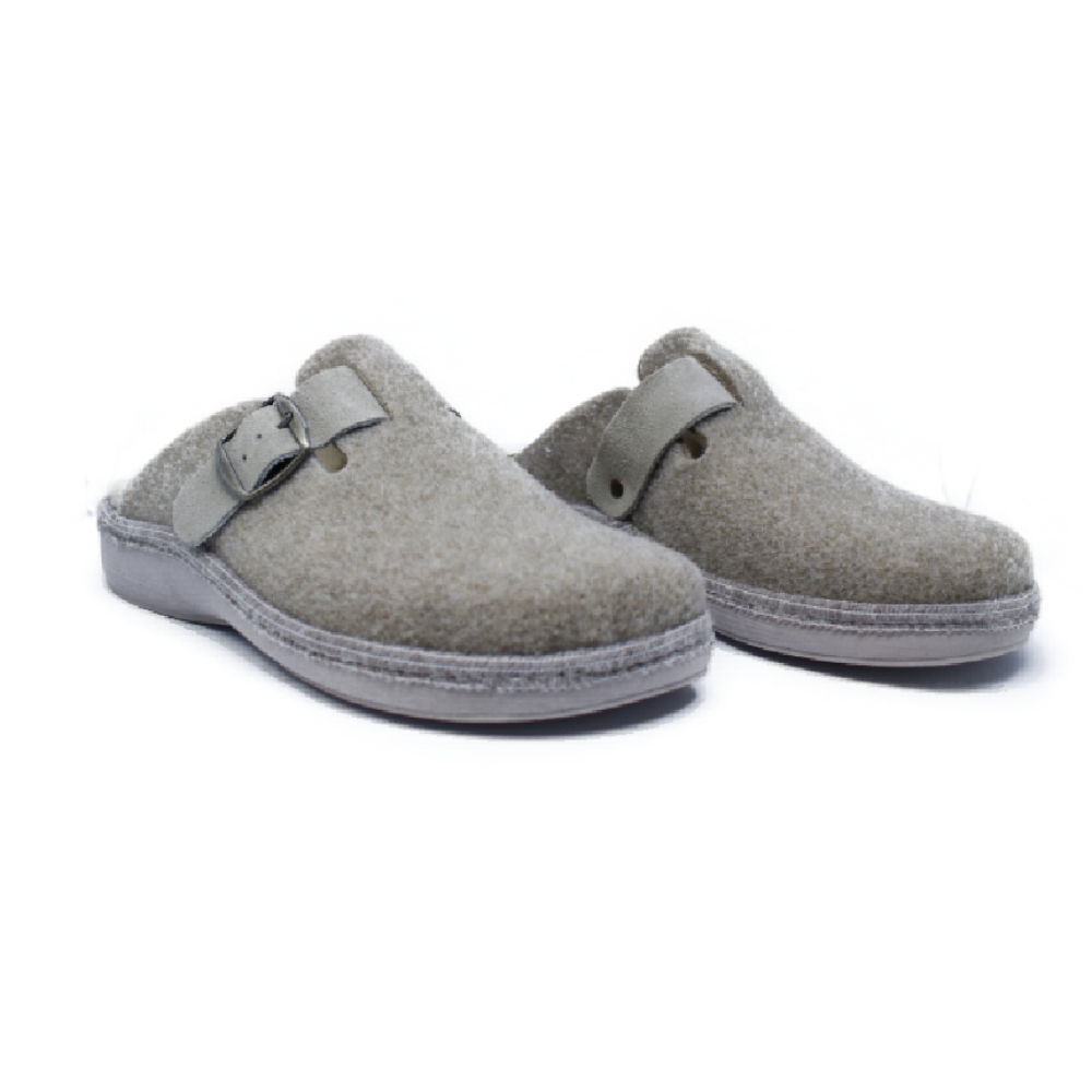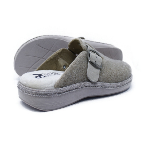 Zapatillas de casa en color beige con hebilla lateral y pelo en la plantilla extraíble. Son una opción cómoda y acogedora para el hogar. El pelo en la plantilla proporciona una sensación suave y cálida, manteniendo tus pies abrigados en todo momento. Perfectas para disfrutar de la calidez y el confort en casa.