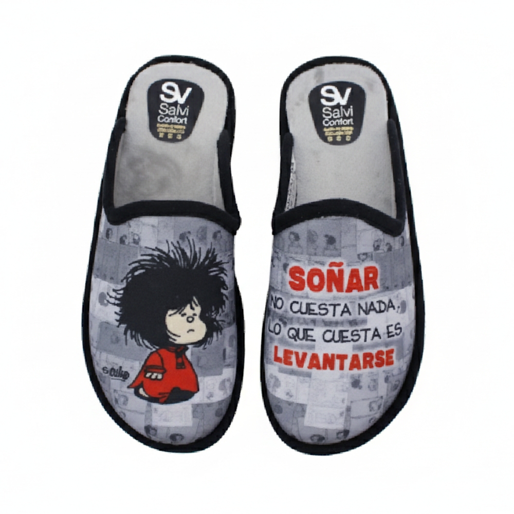 Añade un toque de humor y filosofía a tus mañanas con estas zapatillas de la marca Salvi. El diseño cuenta con un divertido personaje de Mafalda, mientras que la otra zapatilla muestra una frase con la que muchos se sentirán identificados: "SOÑAR NO CUESTA NADA, LO QUE CUESTA ES LEVANTARSE".