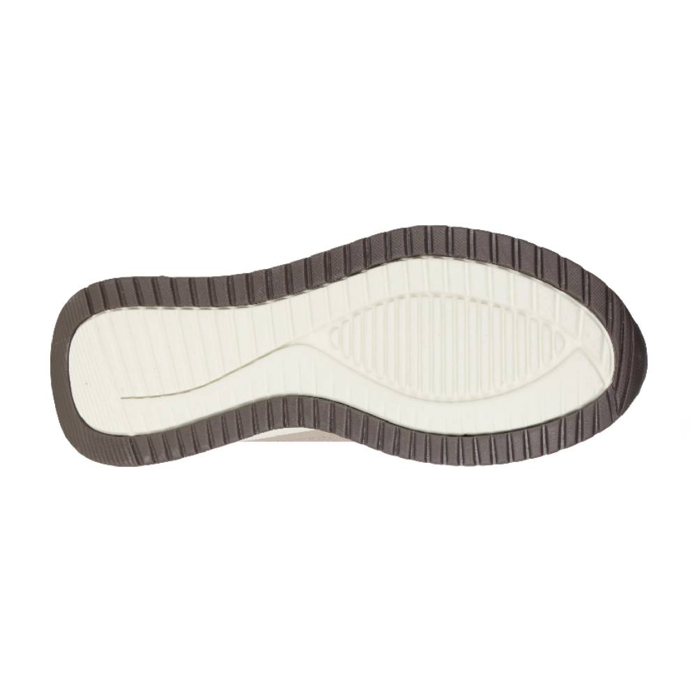 Detalles en Contraste: El elegante color gris de la parte superior se complementa con una suela en tono crema y detalles en azul marino en la base, logrando un look deportivo muy sofisticado.