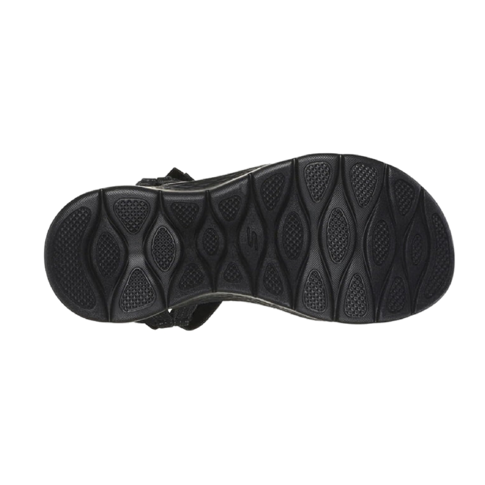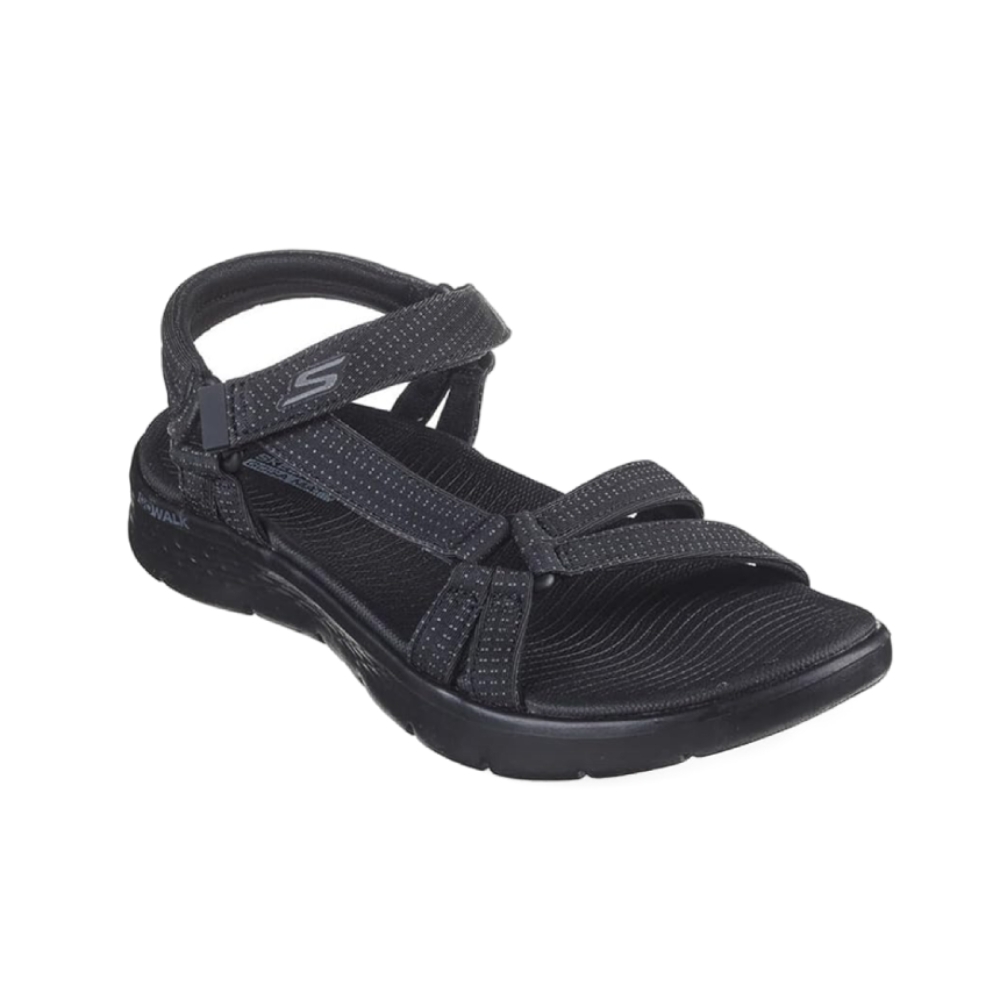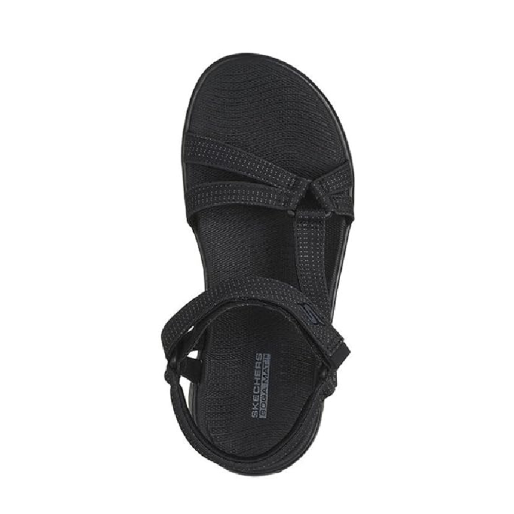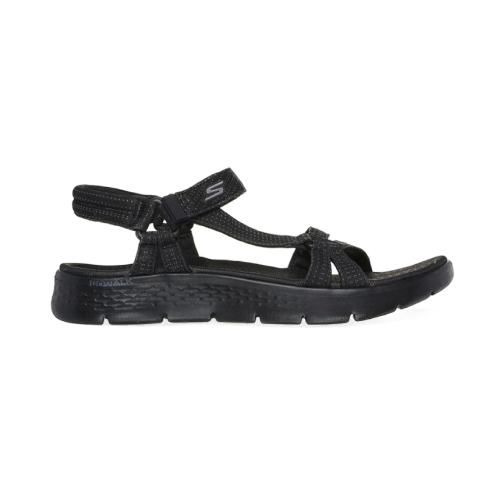 Sandalias Skechers Go Walk Flex Sublime 141451 de mujer en color negro. Presentan un estilo trekking, cierre con tira adhesiva, piso de 2 cm, piso de goma termoplástica, exterior textil e interior forrado textil con plantilla sintética.
