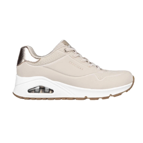 Las zapatillas Skechers Uno Shimmer Away de mujer se caracterizan por su comodidad clásica con cámara de aire. Son unas modernas zapatillas con cordones con parte superior de piel sintética lisa y perforada, una plantilla Skechers Air Cooled Memory Foam y media suela con cámara de aire visible Skech-Air. Presenta detalles metalizados para aportar un toque moderno.