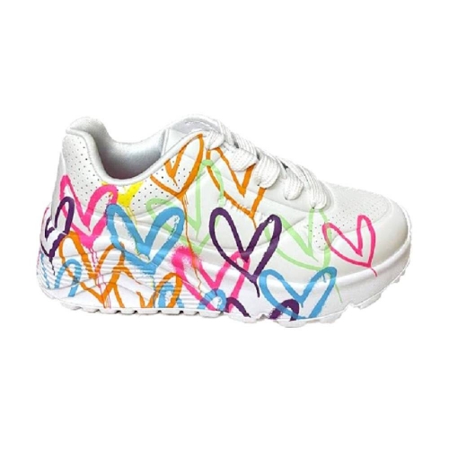 El muralista famoso en todo el mundo James Goldcrown lleva a Skechers sus icónicos diseños de corazón #Lovewall en esta inspiradora colaboración. Muestra tu lado más creativo con Skechers x JGoldcrown: Skechers Street™ Uno Lite - Spread the Love. Zapatilla fashion con cordones con el estampado de corazón característico del artista que se extiende a la suela, parte superior de durabuck sintético con ribete perforado, plantilla Skechers Air-Cooled Memory Foam® y cuña de plataforma con media suela.
