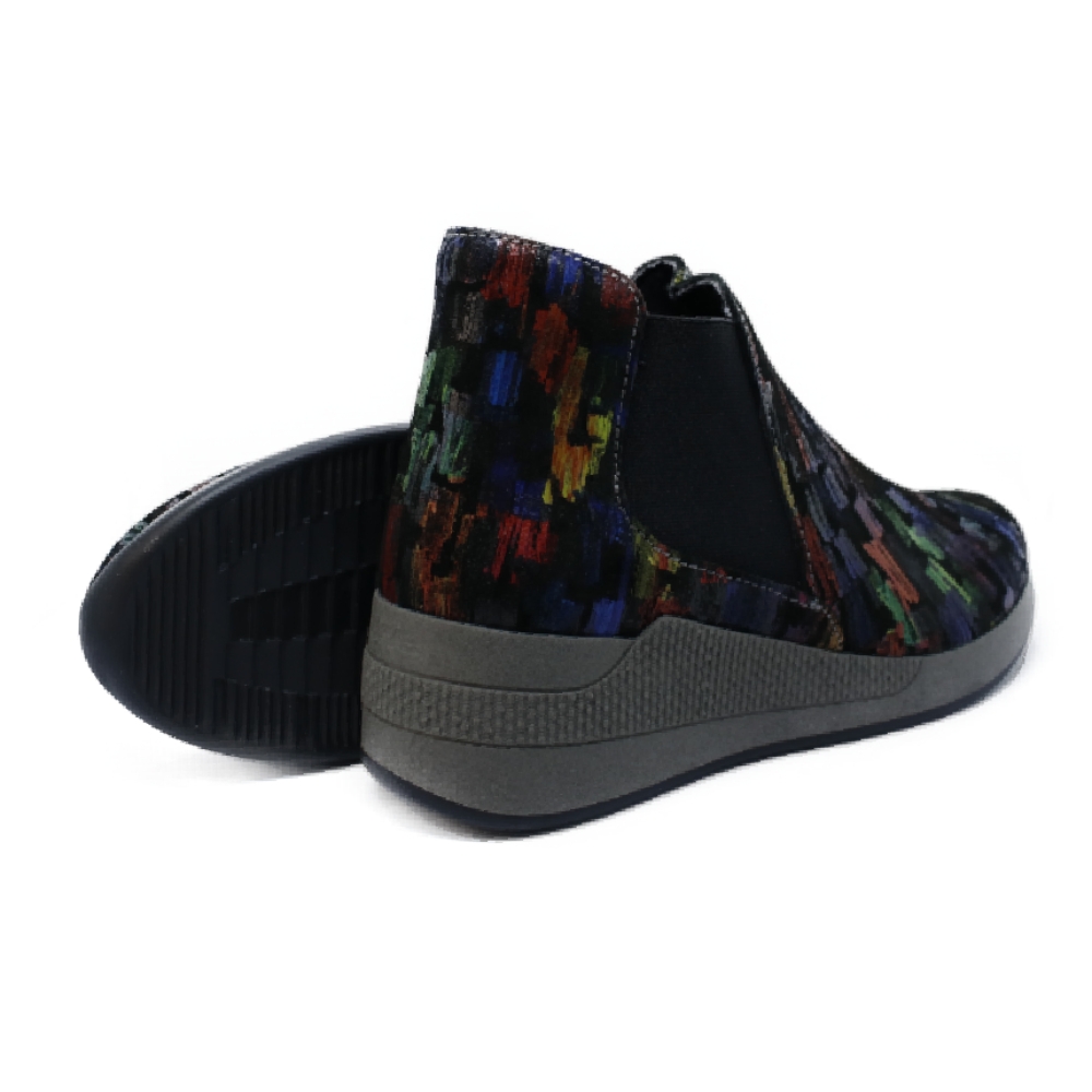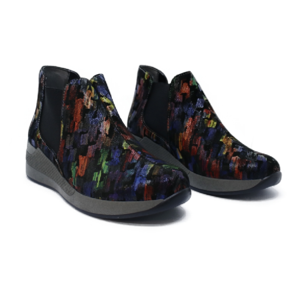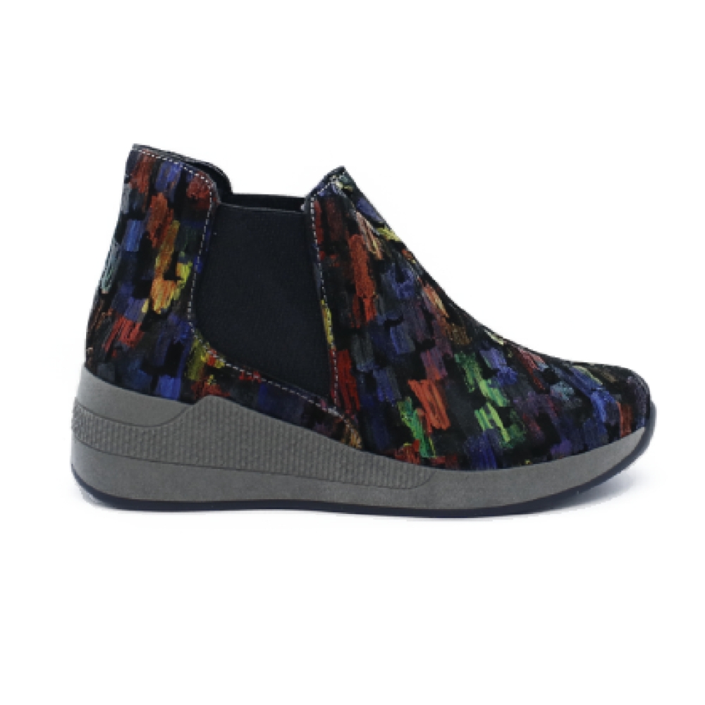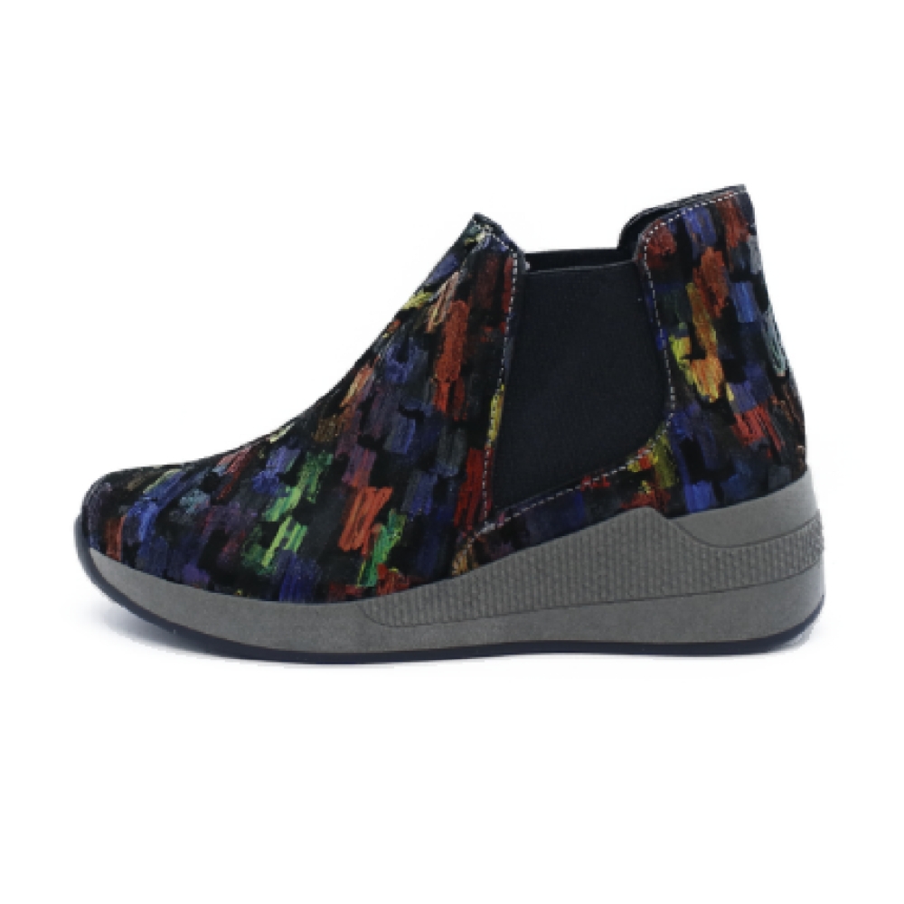 Botín liso con elástico lateral para una mayor facilidad en el calce. Estampado pintura oleo . Con una cuña que ofrece una imagen tan actual como cómoda. Plantilla extraíble, anatómica, en piel y lavable. Piso Verona de 4.5 cms de altura aprox.
