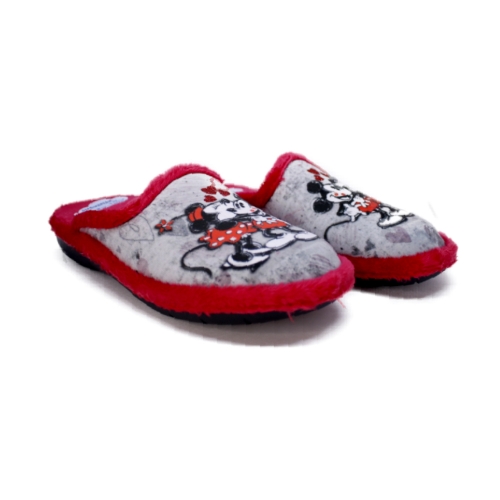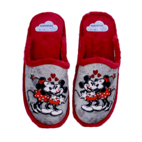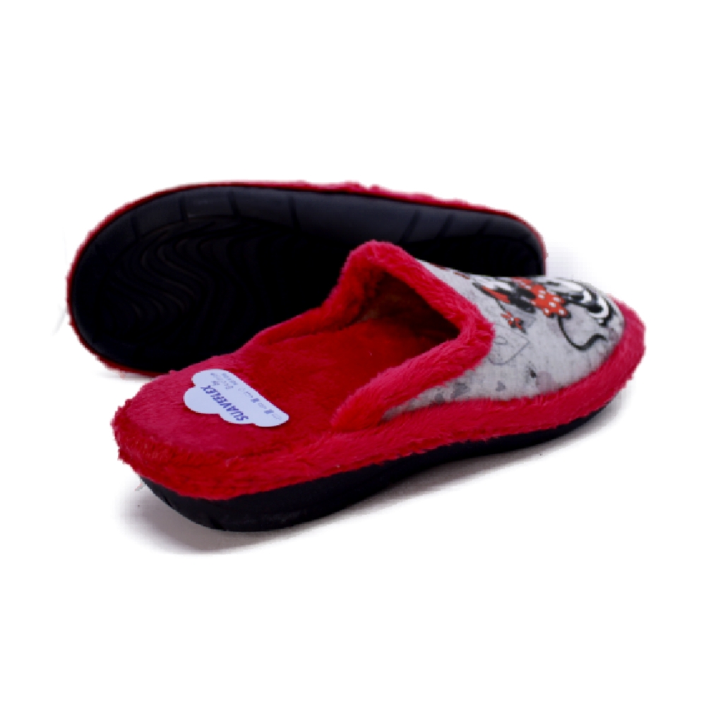 Zapatillas de casa chinela con dibujo de ratoncitos en color gris y rojo de la marca Suaveflex. Detalle de corazoncitos en glitter rojo