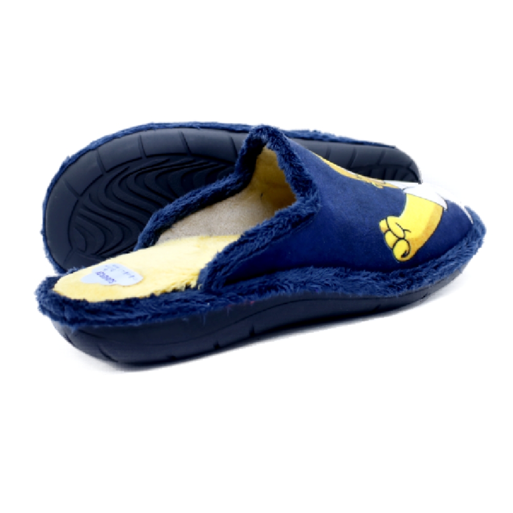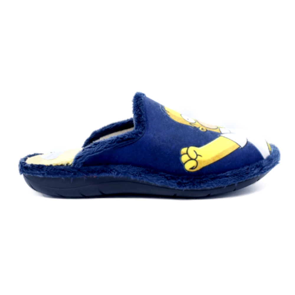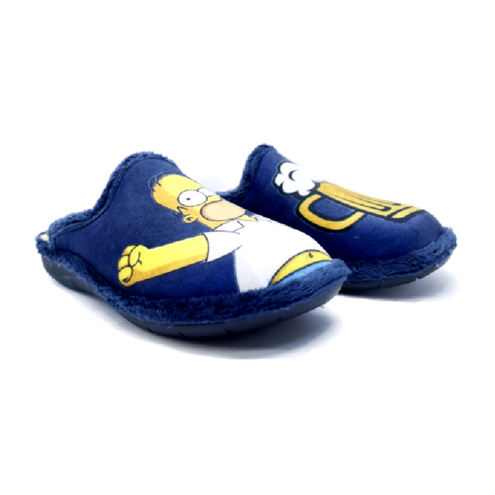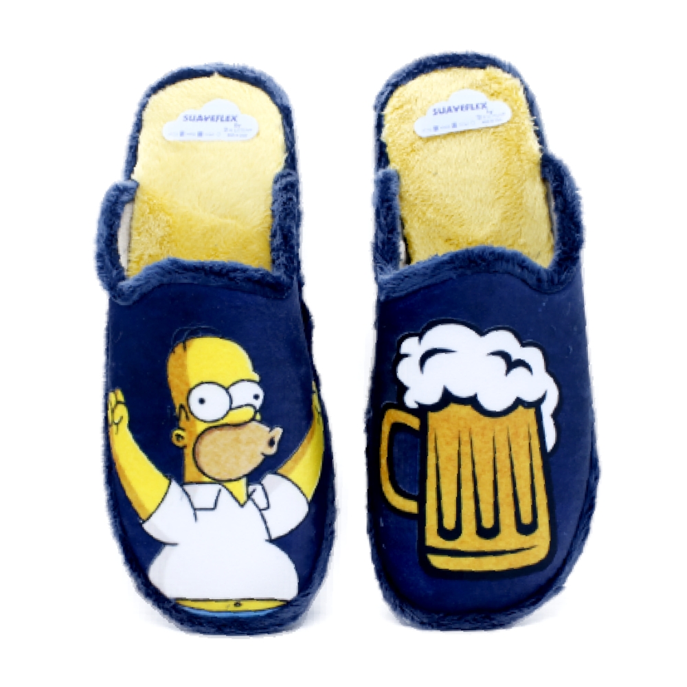 Divertidas zapatillas de casa para hombre de la marca suaveflex modelo 200 marino. Zapatillas descalzas de talón, estilo chinelas, elaboradas en tejido pelo en azul marino con dibujo de Homer Simpson en un pie y una cerveza en el otro pie. Plantillas extraíbles forradas de pelo en amarillo. Piso sintético de goma, con una altura trasera de 2,5cms (1 cm parte delantera).