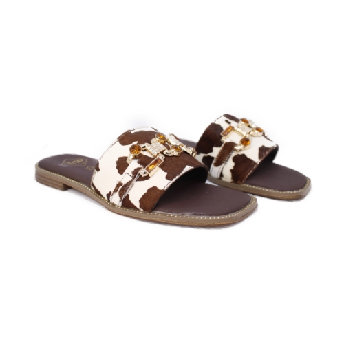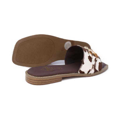 Atrévete a marcar la diferencia con estas sandalias de piel en estampado efecto vaca, perfectas para darle un toque salvaje y sofisticado a tus looks veraniegos. Su diseño tipo pala, con detalle de hebilla dorada, aporta ese punto chic que no pasa desapercibido.