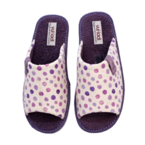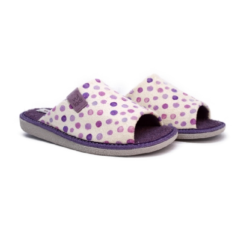Esta zapatilla de casa para mujer, caracterizada por su estampado de lunares o topos en tonos lila, es el modelo Pala Topos Lila de la marca española Vul-ladi. Se trata de una chinela de puntera abierta diseñada para la temporada de primavera/verano, destacando por su comodidad y materiales suaves.