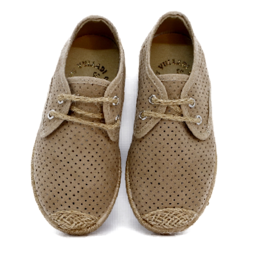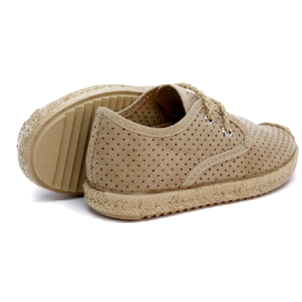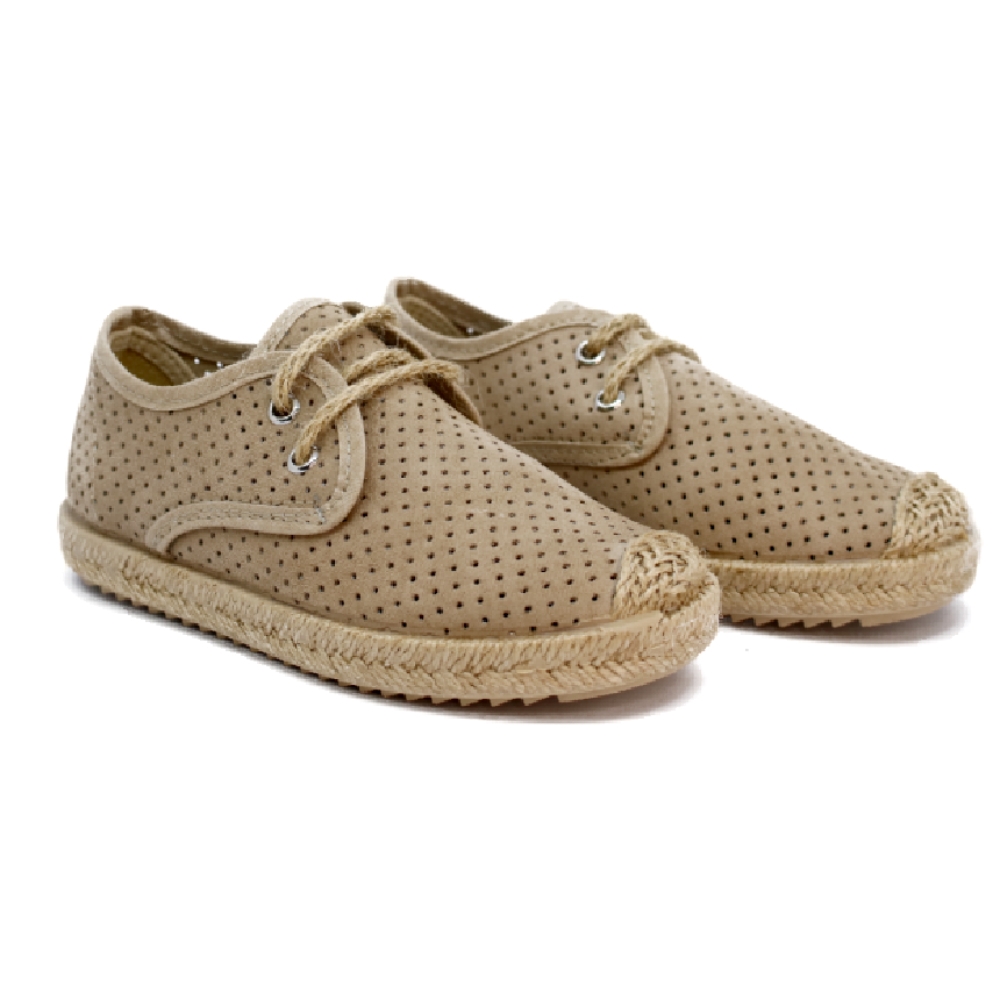 Inglesitas de niño en serraje color beige con cordones a tono. En su interior lleva una plantilla de piel que evita la sudoración y cuida el pie de nuestros peques. La suela de goma inyectada va forrada por una tira de yute. Ideal para todo tipo de ceremonias y eventos y para seguir disfrutándolo todo el verano.