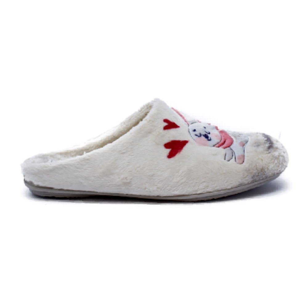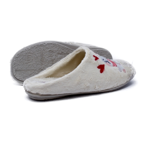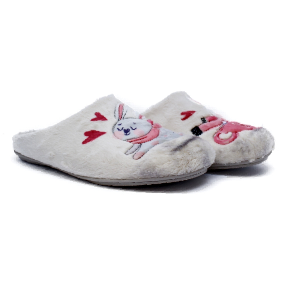 Zapatilla de casa destalonada para mujer, realizada en tejido suave y calentito. Dibujo de Conejito ambos pies. Suela vulcanizada de caucho flexible y antideslizante. Fabricado en España por la marca Vul-ladi.