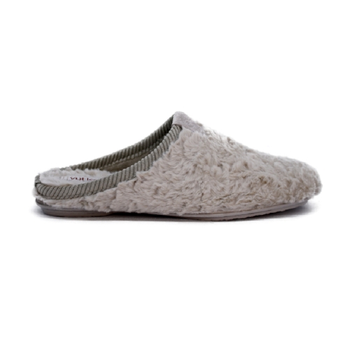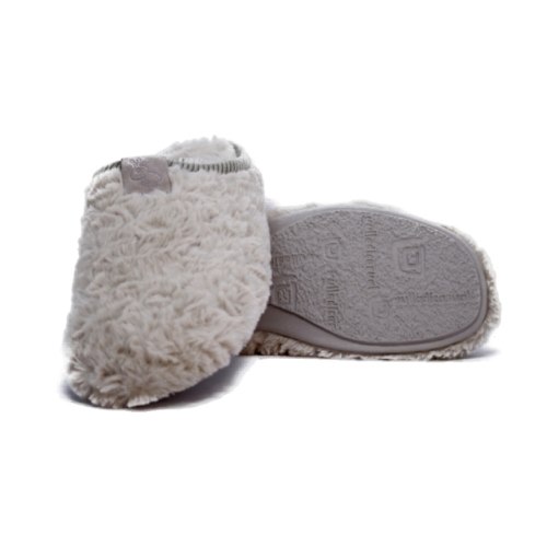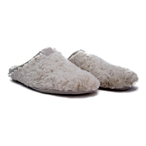 Borreguito de Pelo Largo: Confeccionadas en un tejido de pelo largo y rizado en un color gris perla (greige), estas zapatillas ofrecen una calidez inmediata y un tacto suave y envolvente.