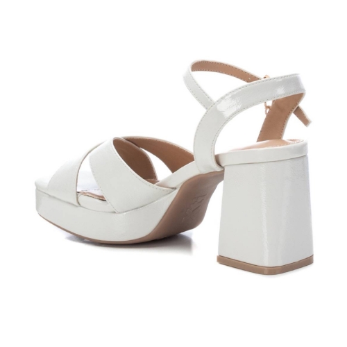 Sandalia elaborada en material sintético estilo charol en color hielo. Cierre de hebilla. Tacón ancho de 8cm aprox. y plataforma de 2cm aporx. Este modelo ha obtenido el certificado vegano por la organización mundial PETA (Organización de los derechos de los animales).