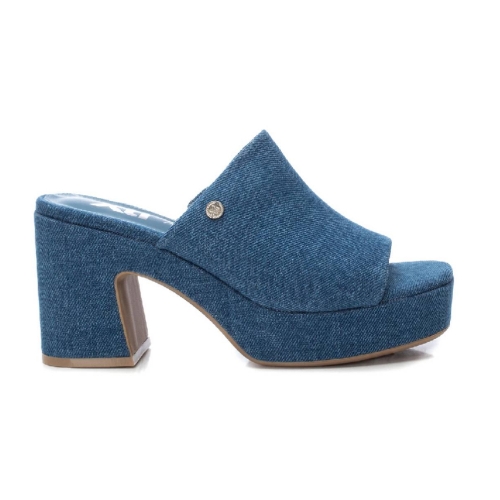 Sandalia vaquera  con puntera abierta, tira ancha y tacón cuadrado revestido. Plataforma 3,5 cm. Tacón 8 cm. Este modelo ha obtenido el certificado vegano por la organización mundial PETA (Organización de los derechos de los animales).