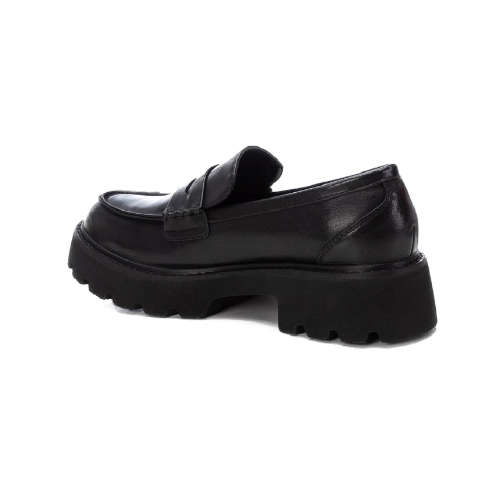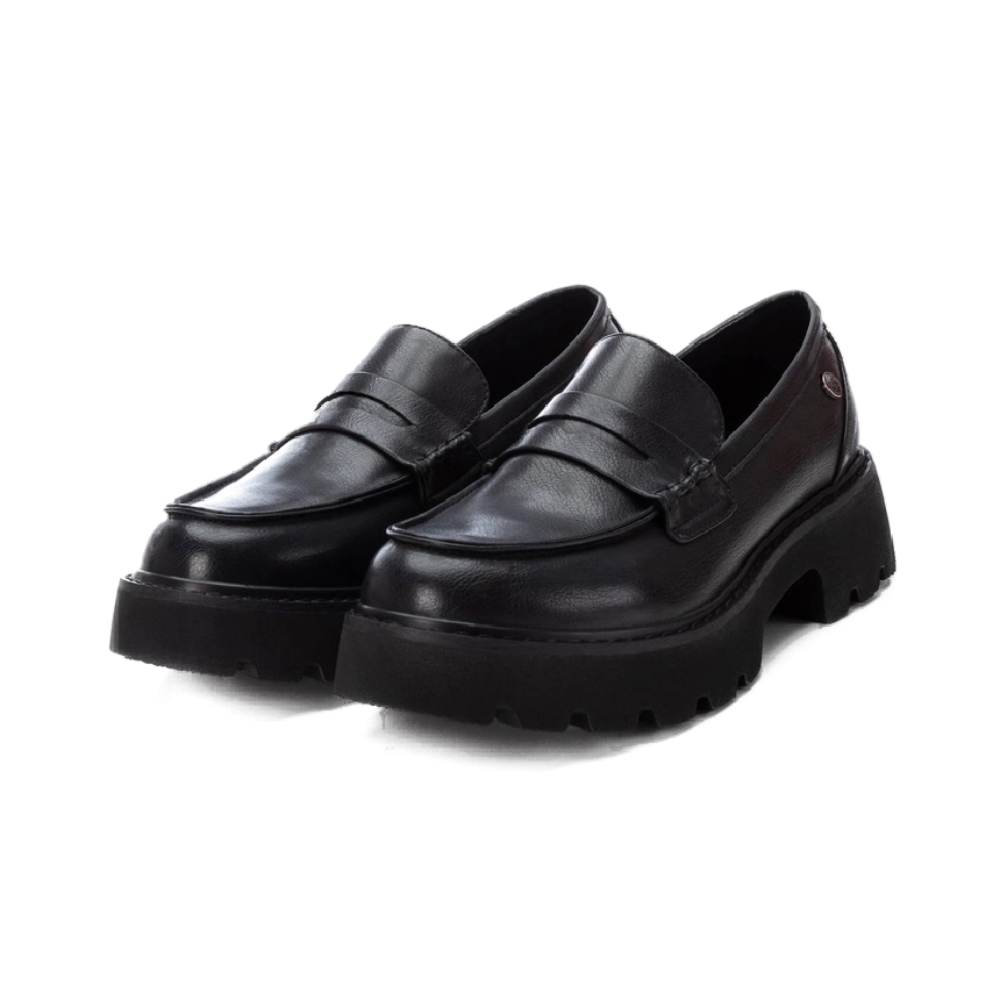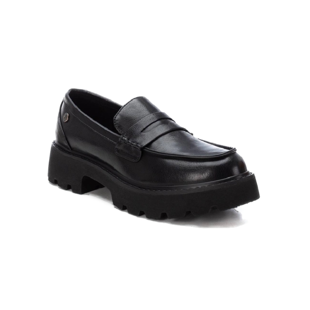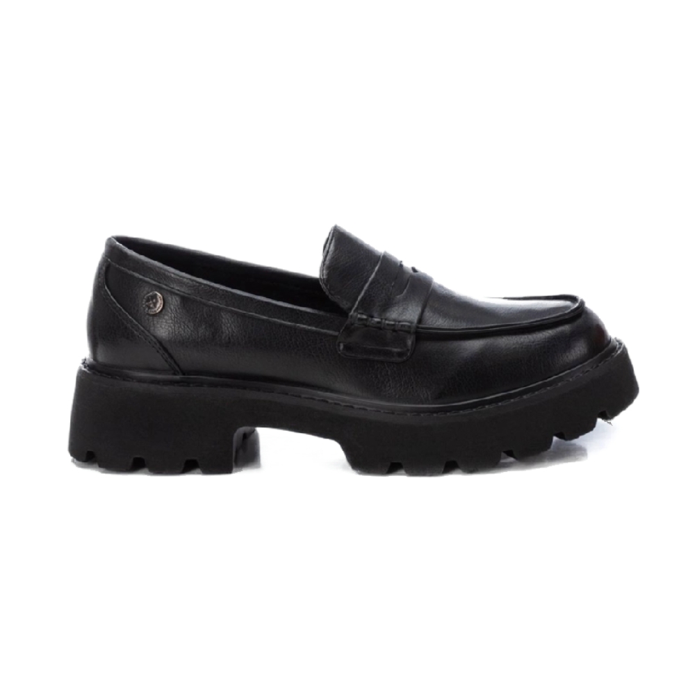 Mocasín de mujer, de la marca Xti. Fabricado en un material que imita la piel. Tacón ancho de 5 cm con suela dentada de goma antideslizante. Un básico de armario. Este modelo ha obtenido el certificado vegano por la organización mundial PETA (Organización de los derechos de los animales).