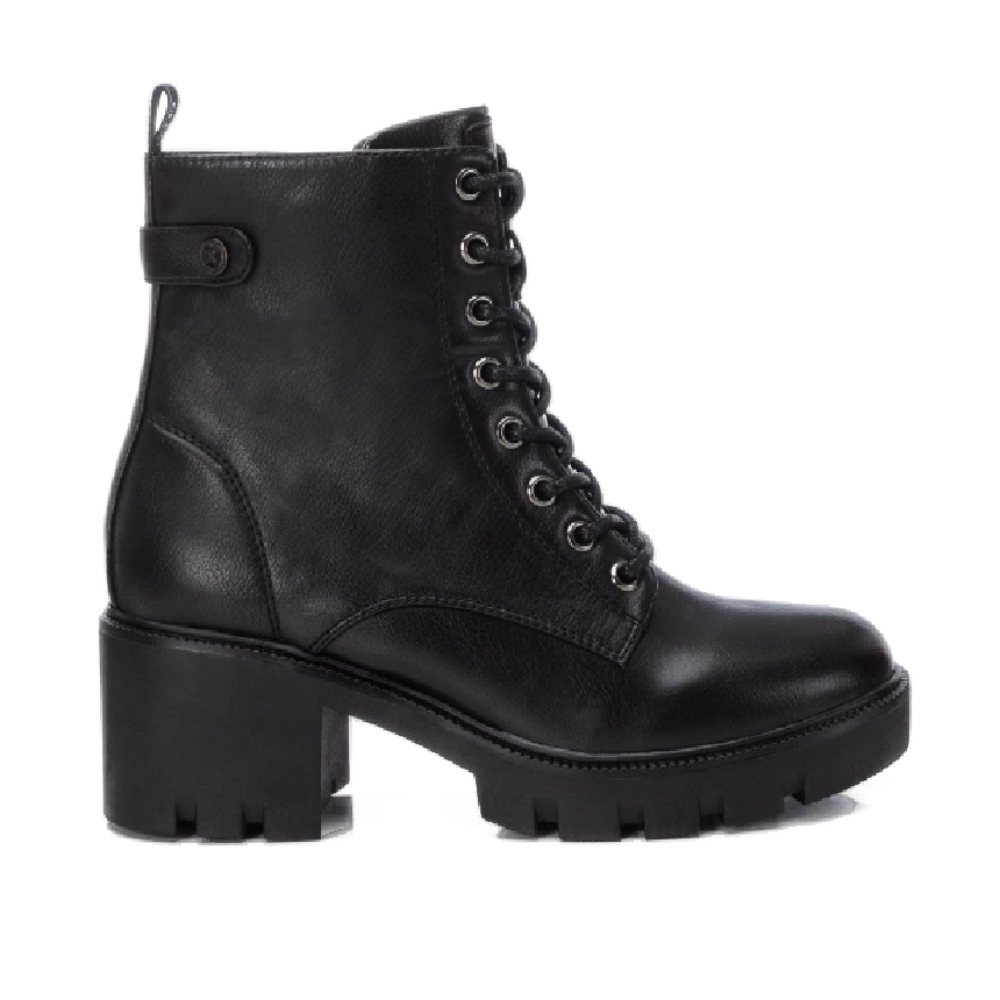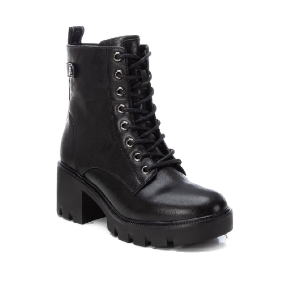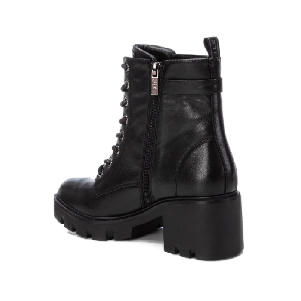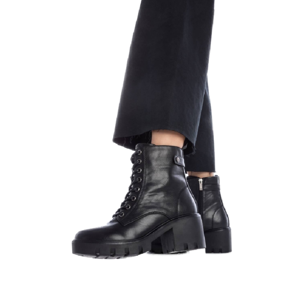 Botín de mujer, de la marca Xti. Fabricado en material que imita la piel. Cierre mediante cremallera lateral y cordones para un buen ajuste. Tirador trasero para facilitar la puesta. Suela gruesa de goma antideslizante con 6 cm de tacón. Un buen básico para tu armario. Este modelo ha obtenido el certificado vegano por la organización mundial PETA (Organización de los derechos de los animales).
