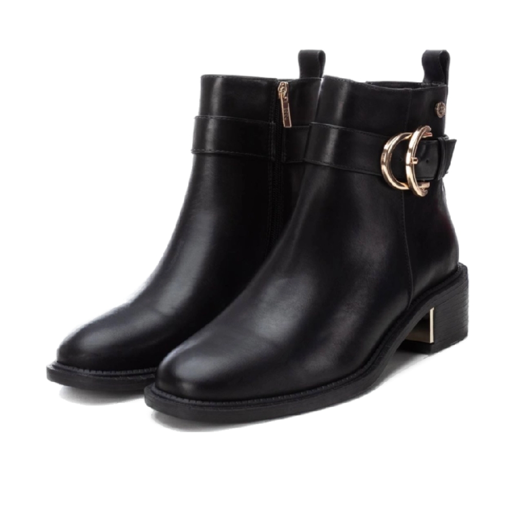 Botín de mujer, de la marca Xti. Fabricado en material que imita la piel. Cierre cremallera interior. Correa decorativa y hebilla metálica. Ideal para el invierno. Este modelo ha obtenido el certificado vegano por la organización mundial PETA (Organización de los derechos de los animales).