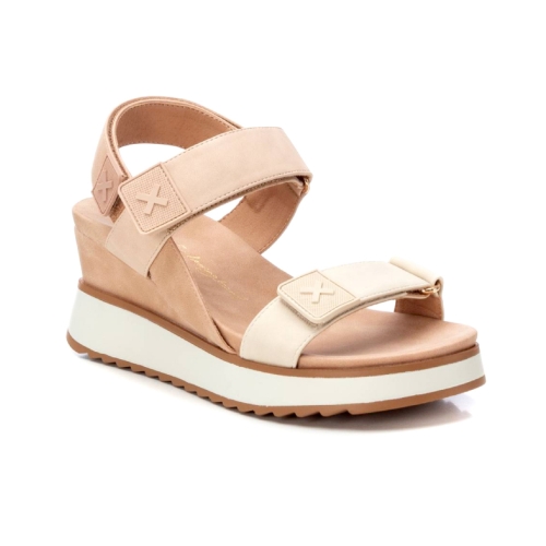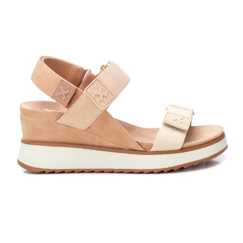 Sandalia de mujer con cuña, de la marca Xti. Fabricada en material que imita la piel, se convertirá en uno de tus esenciales de esta temporada.  Cierre mediante tira adherente. Planta bios. Cuña de 7 cm con suela de goma antideslizante. Este modelo ha obtenido el certificado vegano por la organización mundial PETA (Organización de los derechos de los animales).
