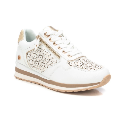 Zapatilla casual de mujer, de la marca Xti. Está fabricada en material que imita a la piel. Bonito troquelado en el lateral. Cordones al tono y cremallera con función en el lateral. Cuña bicolor con suela de goma antideslizante. Con plantilla extraíble. Este modelo ha obtenido el certificado vegano por la organización mundial PETA (Organización de los derechos de los animales).