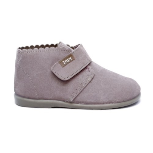 Suave bota de niña realizada en serraje color nude que se ajusta perfectamente a su pie. En su interior tiene una plantila  extraible totalmente plana. Suela de goma flexible y antideslizante. Un zapato totalmente respetuoso con los pies más delicados.
