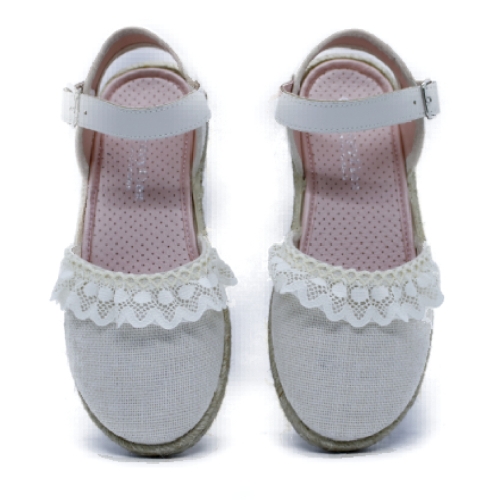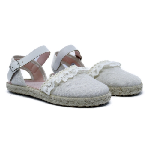 Elegante y delicada alpargata diseñada especialmente para comuniones, pajes, ceremonias y eventos de verano. Fabricada con materiales ligeros y transpirables, presenta una combinación perfecta de comodidad y estilo. Su acabado en tela color blanco con detalles de encaje aporta un toque romántico y sofisticado. La suela de esparto añade un aire tradicional, mientras que la correa ajustable con hebilla asegura un ajuste perfecto y cómodo para todo el día.