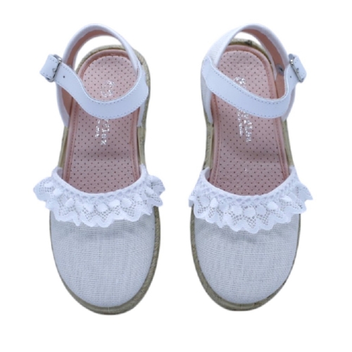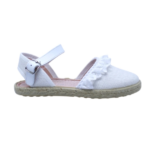 Elegante y delicada alpargata diseñada especialmente para comuniones, pajes, ceremonias y eventos de verano. Fabricada con materiales ligeros y transpirables, presenta una combinación perfecta de comodidad y estilo. Su acabado en tela color blanco con detalles de encaje aporta un toque romántico y sofisticado. La suela de esparto añade un aire tradicional, mientras que la correa ajustable con hebilla asegura un ajuste perfecto y cómodo para todo el día.