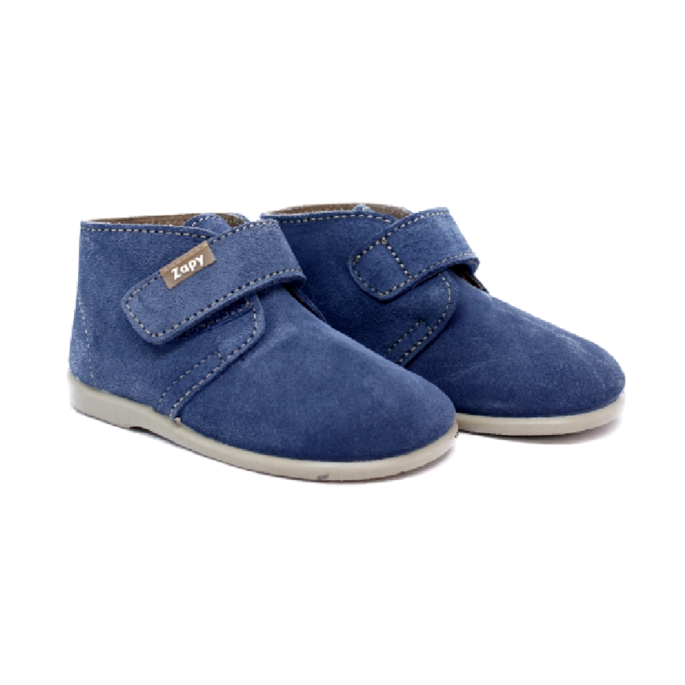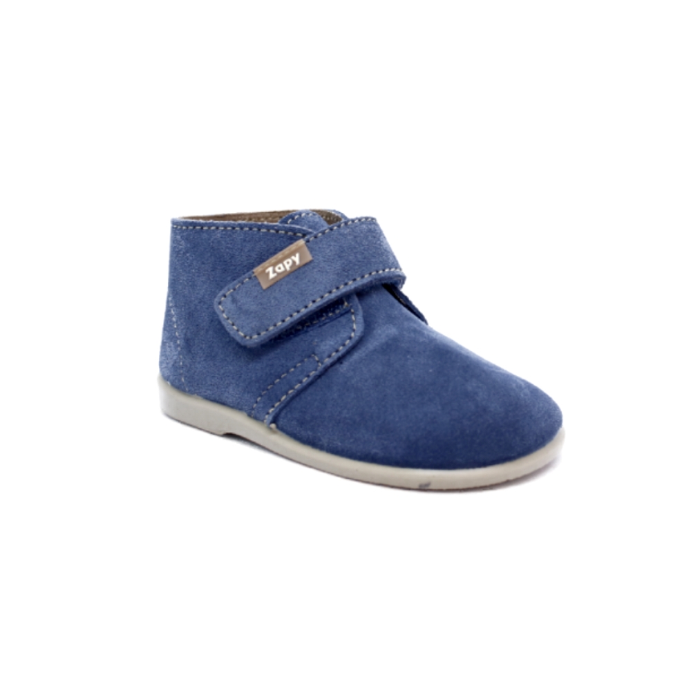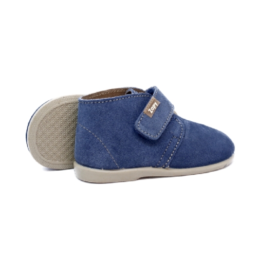 Suave bota unisex realizada en serraje color azul que se ajusta perfectamente a su pie. En su interior tiene una plantila de piel extraible totalmente plana. Suela de goma flexible y antideslizante. Un zapato totalmente respetuoso con los pies más delicados.
