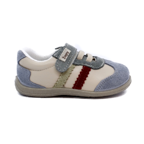 Preciosa y flexible zapatilla deportiva de niño  en tonos crudos  con detalles celestes y granates. Se ajusta mediante velcro y cordones elásticos para conseguir una buena sujeción al piel. En su interior lleva una plantilla extraíble de piel sin ningun tipo de empeine o alza. Suela de caucho totalmente  plana. Un zapato totalmente respetuoso que va a dar libertad a los pies de tu peque.